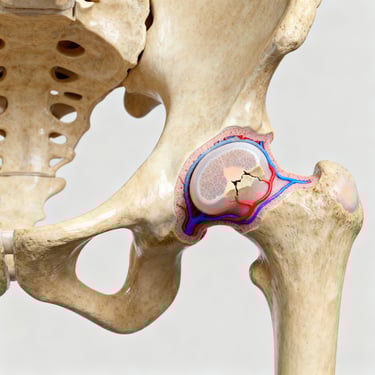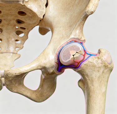 Em muitos desses casos, especialmente entre os 4 e 8 anos de idade, penso na Doença de Legg–Calvé–Perthes, também conhecida apenas como Perthes. Trata-se de uma condição na qual ocorre uma interrupção temporária do fluxo sanguíneo para a cabeça do fêmur (a “bolinha” do quadril), levando a uma necrose avascular transitória que, se não for bem acompanhada, pode deformar a articulação. É uma doença geralmente unilateral, mais comum em meninos, e que evolui por fases: necrose inicial, fragmentação, reossificação e remodelação. Meu objetivo, desde o primeiro contato com a família, é orientar, aliviar a ansiedade e traçar um plano que proteja o quadril enquanto o osso “se cura” e se remodela.